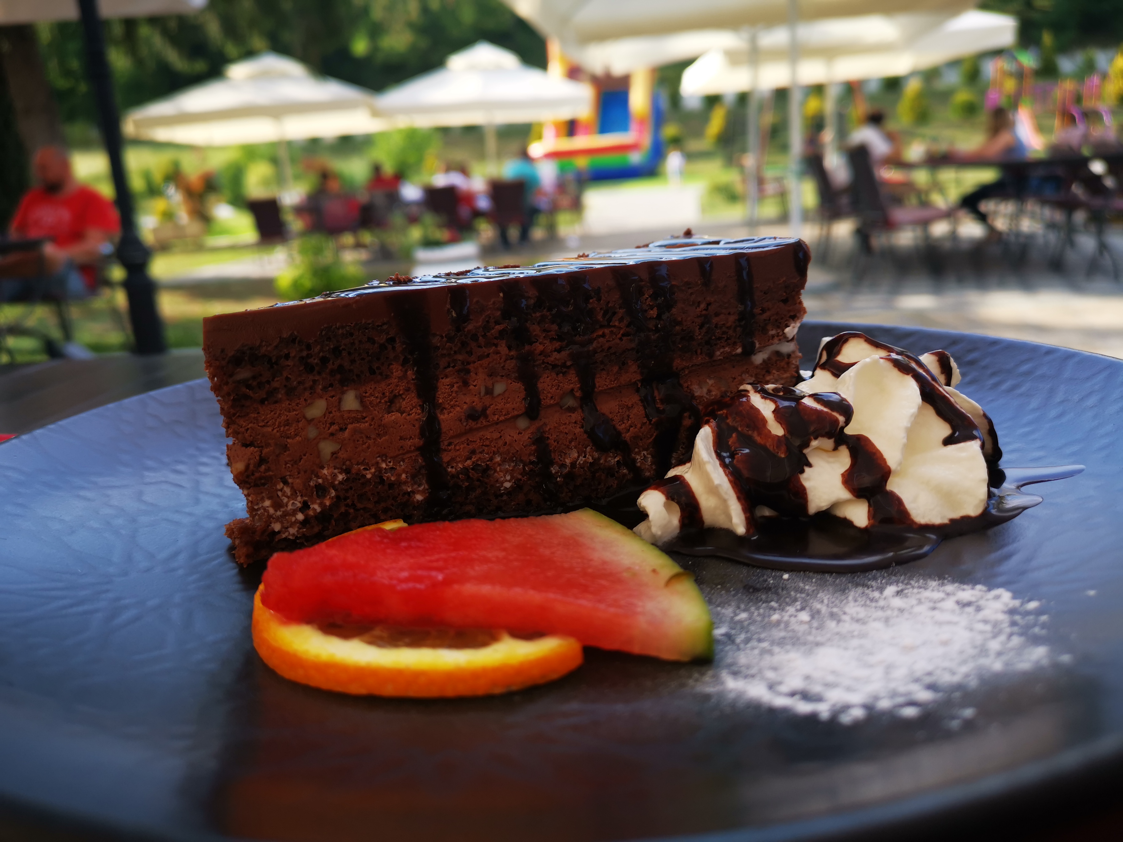 Ispred dvorca je divna terasa u čijem je središtu „jezerce“ s fontanom i zaista je lijepo i ugodno popiti kavu, doručkovati, ručati, večerati vani. Glazba je nenametljiva i ne ometa razgovor. Imaju i sadržaj za djecu, ljuljačku, klackalicu, trampoline i napuhanca za skakanje. Hrana je odlična. Barem ono što smo probali. Kako ja imam problema sa prehranom i namirnicama koje smijem konzumirati uspjela sam naći nešto i za sebe, tipa salata sa piletinom (iz koje mi je bilo lako izdvojiti ono što ne jedem), a imaju i dječji menu, kolače, palačinke, sladoled, a muška strana je oduševljena Rib-eye odreskom.